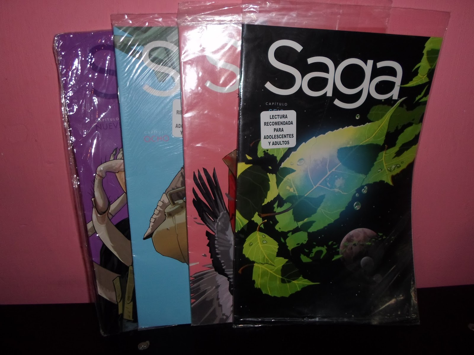 Y los últimos que llegaron a mis manos son los volúmenes 6, 7, 8 y 9 de Saga escrito por Brian K.Vaughan e ilustrado por Fiona Staples, estos volúmenes no tenía pensado comprarlos o encontrarlos ya que ese día estaba buscando en especifico Deadpool mata al universo Marvel pero no lo encontré en el Sanborns al cual fui. Este cómic me esta gustando mucho, en serio, y el comienzo de este cómic es increíble y me hizo reír mucho, los protagonistas son increíbles y tenia demasiadas ganas de seguir con el cómic pero cuando lo leí solamente estaban publicados cuatro volúmenes pero cuando fui un sábado a desayunar con mi madre (el mismo día que me compro Viaje al centro de la Tierra, Ilíada y Odisea) y en cuanto los vi en Sanborns no me pude resistir a comprarlos ya que quería seguir con el cómic, estaban estos cuatro y el volumen once pero no estaba el diez así que no compre el once.